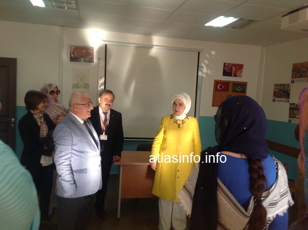 قامت حرم الرئيس التركي "امينة اردوغان" رفقة ابنت الرئيس الموريتاني "اسمى بنت محمد ولد عبد العزيز اليوم الثلاثاء بزيارة تفقد واطلاع على سير العمل والمناهج التربوية المتبعة في مدارس "العارف" التركية بموريتانيا.