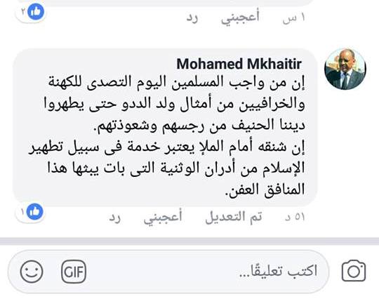 قال والد كاتب المقال المسيء محمد ولد امخيطير الذي فرّ الى فرنسا في السنة الماضية إن من واجب المسلمين اليوم التصدي للكهنة والخرافيين من أمثال الشيخ الددو وتطهير الدين الحنيف منهم .