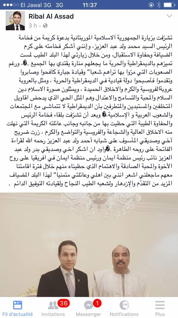 أشاد كذلك رئيس منظمة "إيمان" العالمية ريبال الأسد في ختام زيارة لموريتانيا في بيان نشر على صفحته على الفيس بوك صباح اليوم الجمعة، بأصالة موريتانيا وهويتها الراسخة وتمسك شعبها بقيم العروبة الخالصة، وريادة البلد في مجالات الحرية والديمقراطية، واعتبرها نموذجا يعطي صورة ناصعة للإسلام كدين للسلام والمحبة والتسامح والإعتدال، تدحض أقاويل المرجفين والمتخلفين وتثبت قدرة المسلمين والعرب على الإنسجام مع قيم الديمقراطية وإعطاء نموذج يحتذي.
