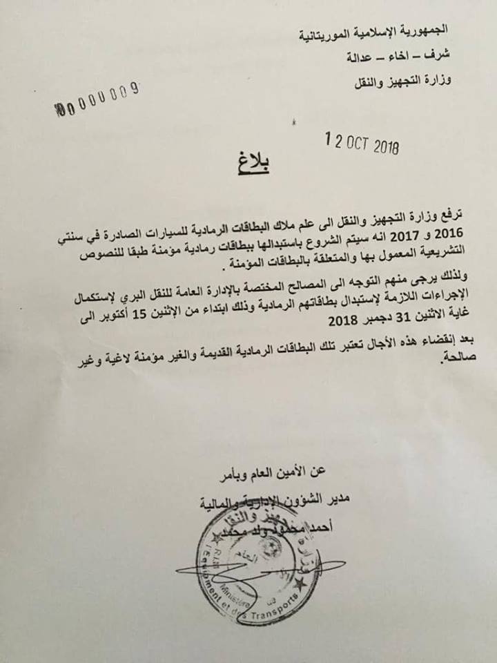 أصدرت وزارة التجهيز والنقل بلاغا إلى ملاك السيارات بخصوص البطاقة الرمادية للمركبات ,ويتعلق الامر بتلك الصادرة عامي 2016 ـ 2017. وهذه صورة البلاغ كما وردت الى موقع أطلس انفو بلاغهاممنوزارةالتجهيزوالنقل