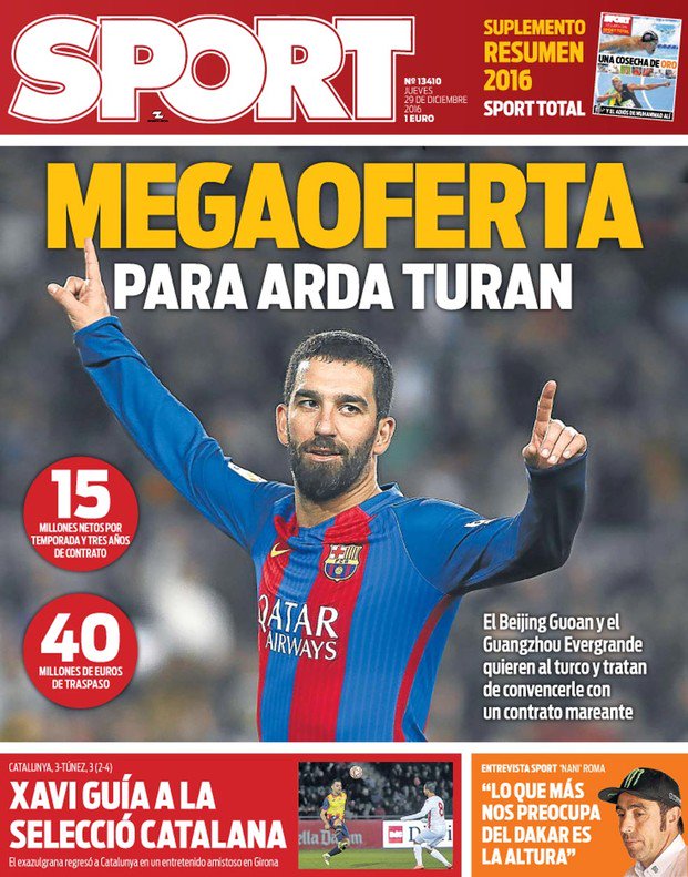 تلقى التركى أردا توران لاعب وسط برشلونة الإسبانى عرضين من ناديين صينيين مقابل 40 مليون يورو.