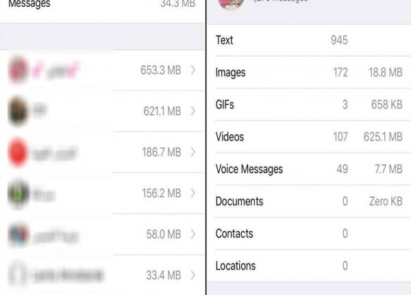في هاتف آيفون، على المستخدم التوجه إلى قائمة الإعدادات “Settings” ثم “Data and Storage Usage” ثم “Storage Usage”، فتظهر قائمة بأسماء الأشخاص والمجموعات التي تواصلت معه مرتبة من أكثرهم تواصلا إلى أقلهم.