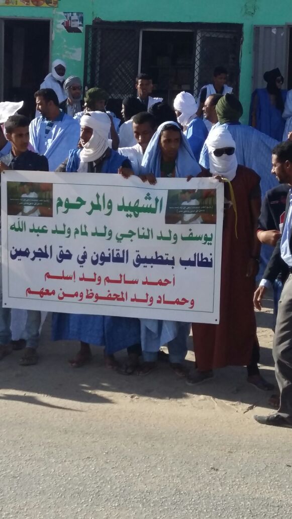 على ساحة محكمة ولاية نواكشوط الجنوبية احتجاجا وتنديدا بمقتل الشاب / يوسف ولد الناجي ولد الامام الذي تم قتله بدم بارد طعنا بالسكاكين من قِبل شخصين بالغين , حيث كان يحمل دفاتره ذاهبا الى مدرسته في الصباح الباكر.