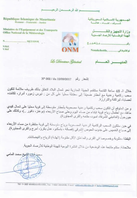 وجاء في البيان أن الجبهة المدارية نحو شمال البلاد ستتقدم خلال 48 ساعة القادمة لتخلق ظروفا ملائمة لتكوّن سحب ركامية رعدية مع امطار ضعيفة الى متوسطة.